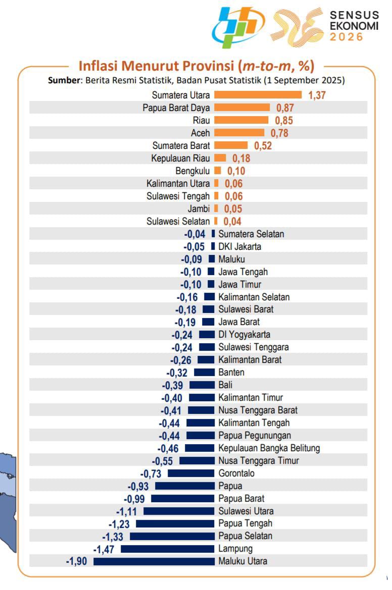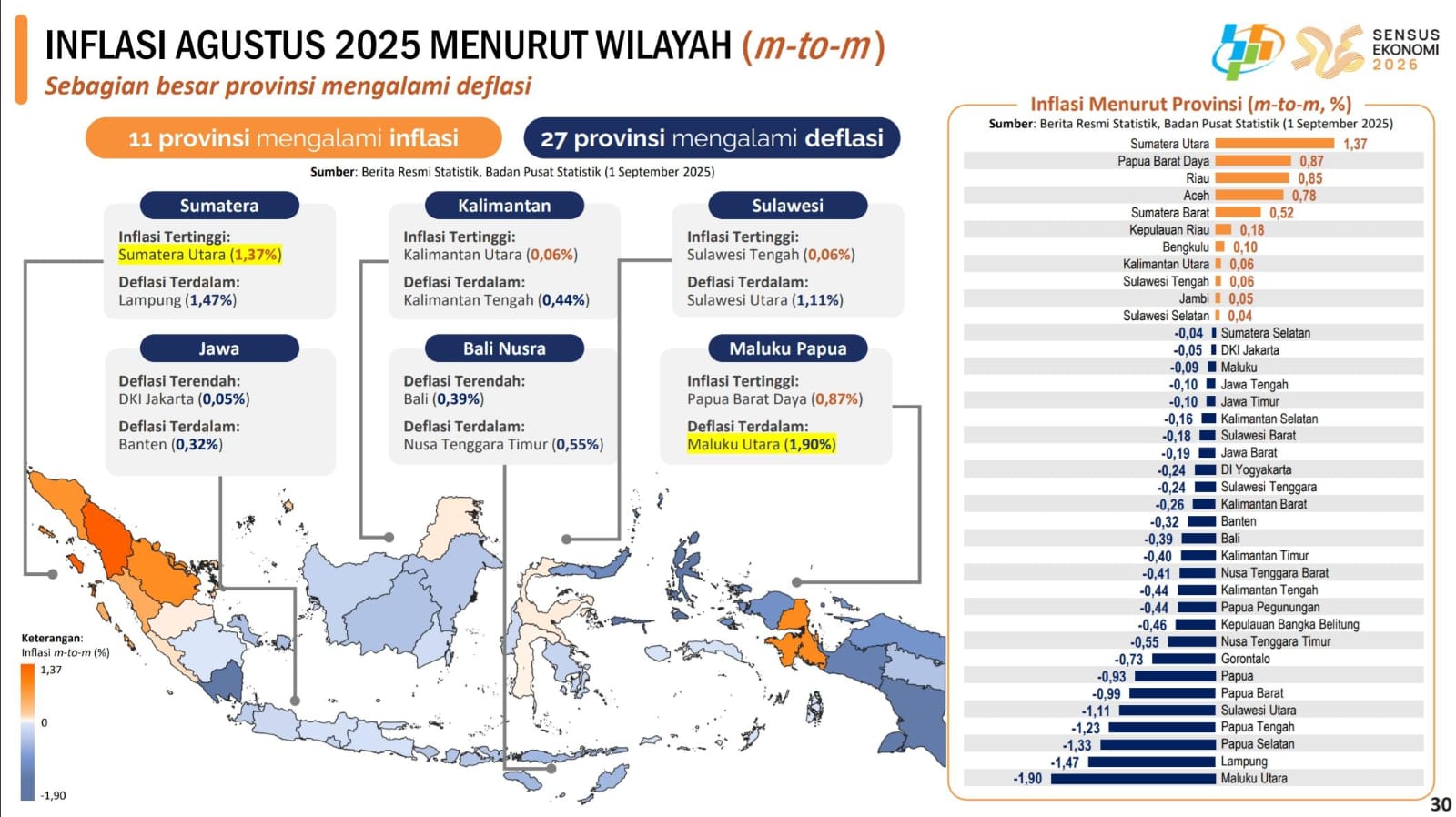 Namun, yang paling mengejutkan adalah peran kelompok pendidikan sebagai penekan inflasi daerah. Dari empat subkelompok, dua di antaranya mengalami deflasi, yakni pendidikan dasar dan anak usia dini (1,77 persen) serta pendidikan menengah yang turun tajam hingga 51,23 persen. Sebaliknya, pendidikan tinggi justru meningkat 11,95 persen dan pendidikan lainnya naik 4,30 persen. Secara keseluruhan, kelompok pendidikan menyumbang deflasi (y-on-y) sebesar 0,98 persen, terutama dipicu penurunan biaya pada jenjang SMA/SMK, SMP, dan SD.
